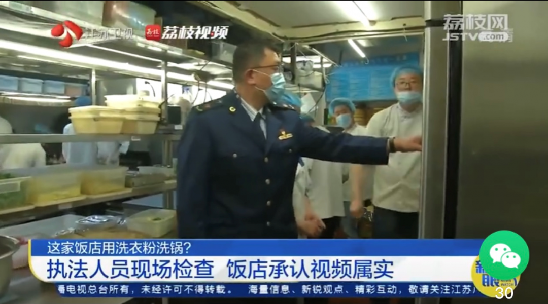 记者陪同几名离职员工来到南京市秦淮区市场监督管理局朝天宫分局,执法人员随即来到调鼎居饭店调查,此时后厨已经看不到洗衣粉的踪影,但老板和员工承认此前员工拍到的视频属实。
