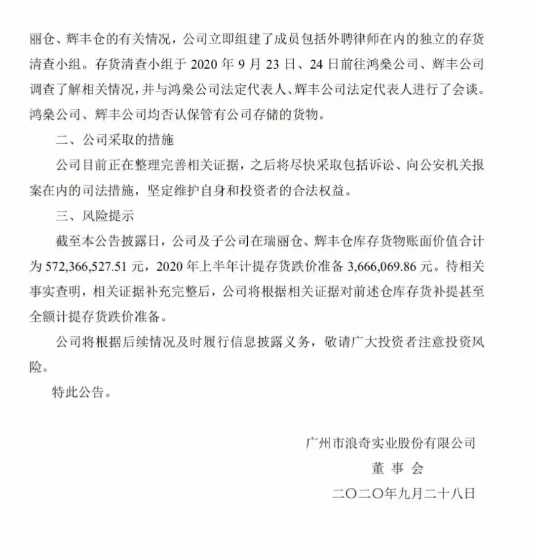 9月27日,广州市浪奇实业股份有限公司(下简称“广州浪奇”)披露一份关于部分库存货物可能涉及风险的提示性公告。公告中称,公司与鸿燊公司签订合同,公司将货物储存于鸿燊公司的瑞丽仓。公司与辉丰公司签订合同,约定公司将货物储存于辉丰公司的辉丰仓。但辉丰否认有货物存储在辉丰公司。公司组建了成员包括外聘律师在内的独立的存货清查小组,小组于9月23日、24日前往鸿燊公司、辉丰公司调查了解相关情况。截至公告日,公司及子公司在瑞丽仓、辉丰仓库存货物账面价值合计为5.72亿元。待相关事实查明,相关证据补充完整后,公司将根据相关证据对前述仓库存货补提甚至全额计提存货跌价准备。公告显示,由于公司相关人员多次前往瑞丽仓、辉丰仓均无法正常开展货物盘点及抽样检测工作,公司于2020年9月7日分别向鸿燊公司、辉丰公司发出《关于配合广州市浪奇实业股份有限公司现场盘点、抽样储存于贵司库区的货物的函》,要求鸿燊公司、辉丰公司配合公司进行货物盘点及抽样检测工作。